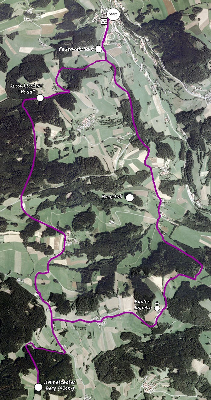 Über die „Hoad” (820 m) wie Hi 4, Hi1, mit Abstecher „zum Weitblick“. Traumhafte Aussicht von Norden über Reichenthal nach Tschechien, Schneeberg und Ötscher im Osten und südöstlich bis zum Gr. Phyrgas. Über den Ottenschlägerberg (teilweise am Forstweg), mit Abstecher zum Teufelsbründl, dann die Bezirksstraße überqueren; weiter nach Hofreith, danach rechts den Feldweg entlang. Traumhafte Aussicht in das untere Mühlviertel!Hier gibt es die Möglichkeit, den in ca. 700 m entfernten Helmetzedterberg (924 m) zu bewandern. Links nach Pemsedt, über den Binderhof zum alten Hinterleitnerhaus (Zeißbergblick), dann über Kerneck, mit Abstecher zum Burgstall.„BURGSTALL” ist eine Ausgrabungsstätte eines bäuerlichen Ansitzes mit Turm (Ein Turm war das Zeichen der Freiheit. Besitzer waren die Gusner auf Kerneck - letztmalige